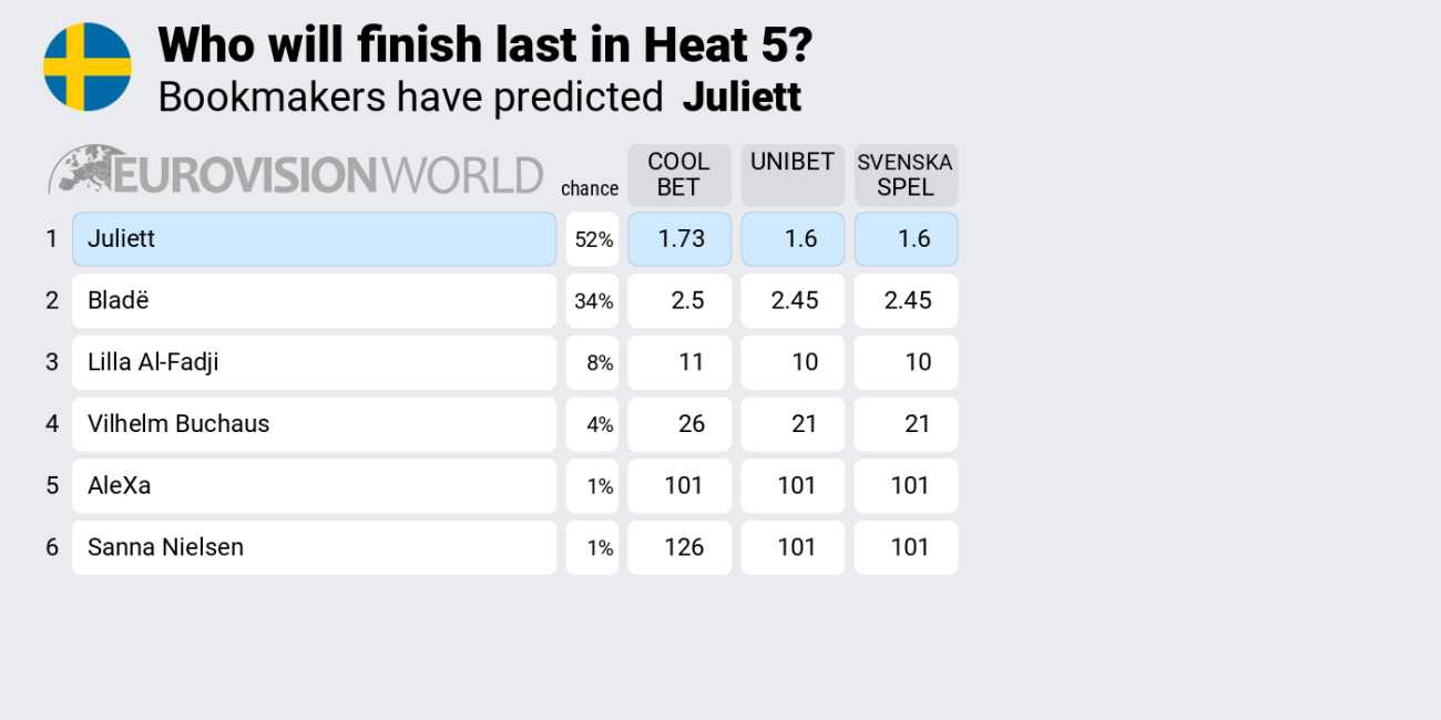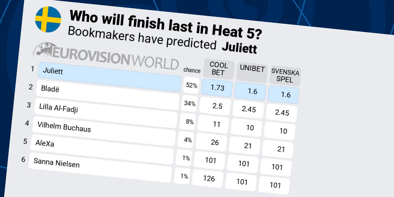 Odds Melodifestivalen 2026: Heat 5 – Last place